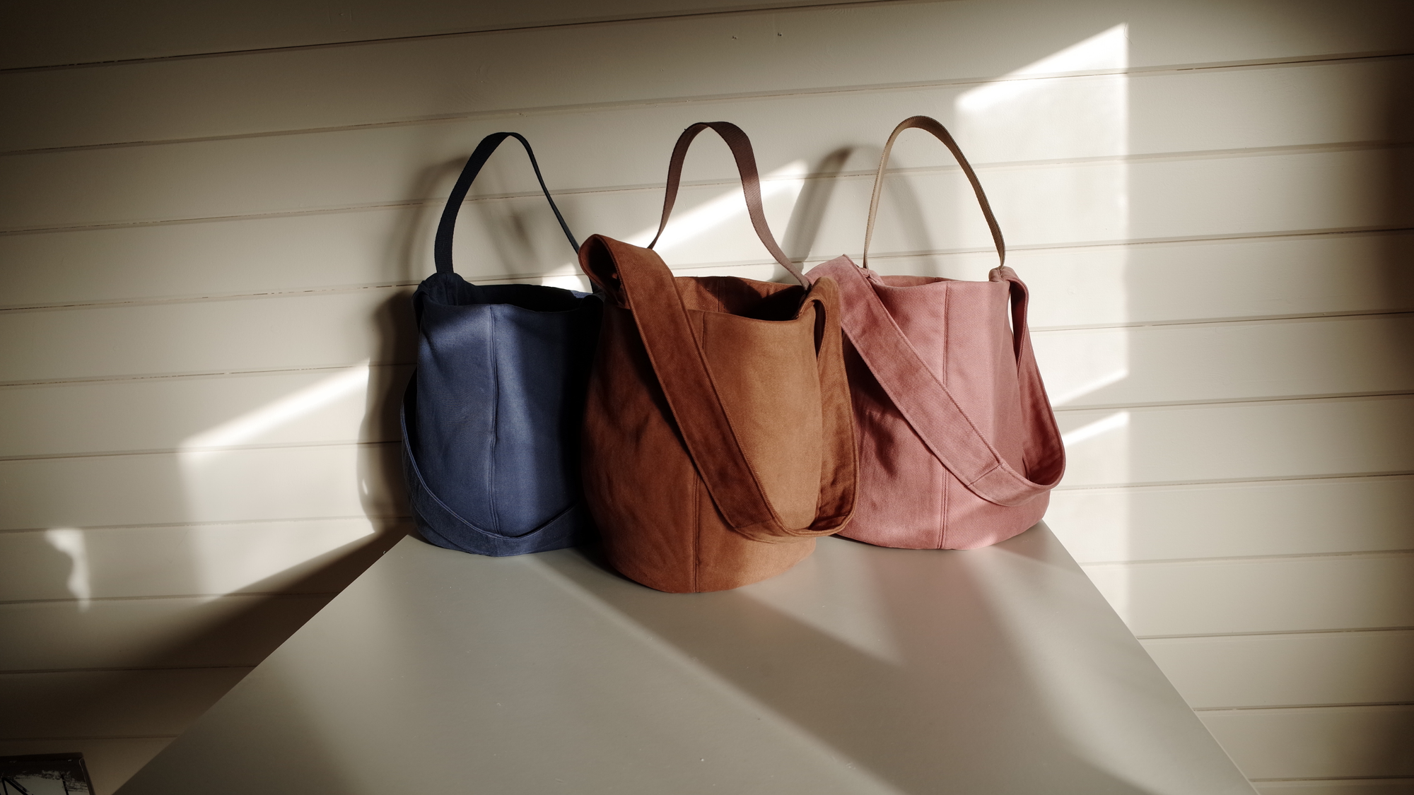 Soft, washed shades of pink, blue, and tobacco twill, made from high-end trouser remnants in our garden studio. Each bag is layered with wool and recycled PET wadding for a soft yet structured shape.