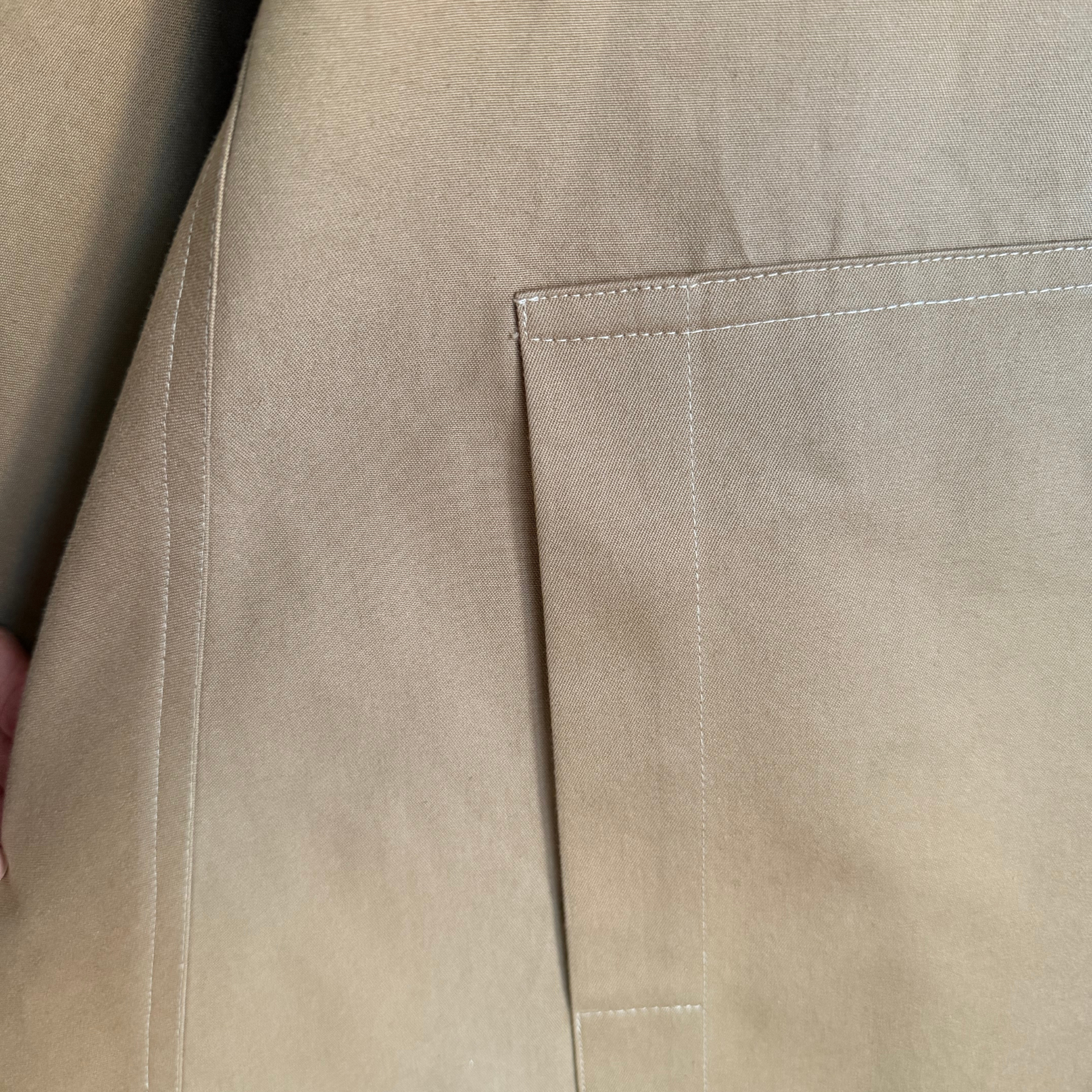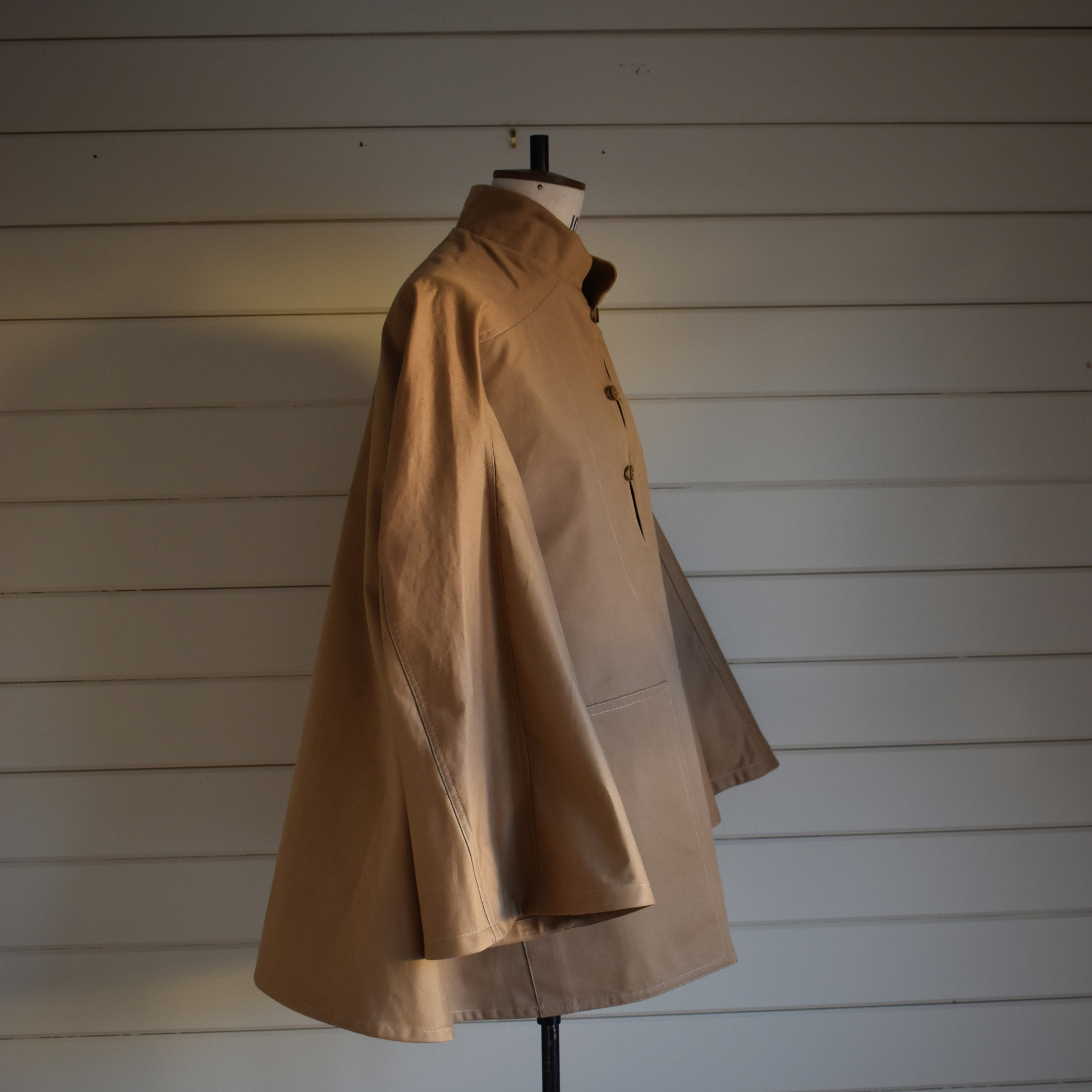 Hemp-dyed tobacco buttons complement the sand poplin, the smock’s effortless volume and flowing lines give it presence without constraint, making it a versatile piece for layering or standalone wear.
