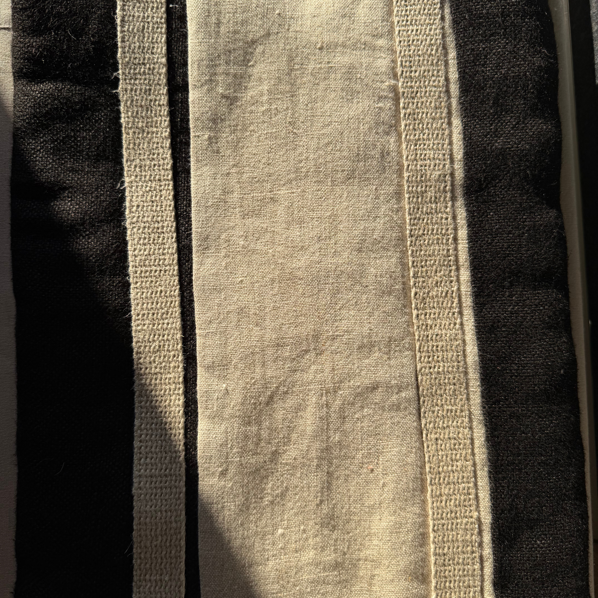 These bags are lightly wadded from UK wool, combining the modern colour variation and composition of stark linear patterns the wadded softness of this structure adds a much needed softness.