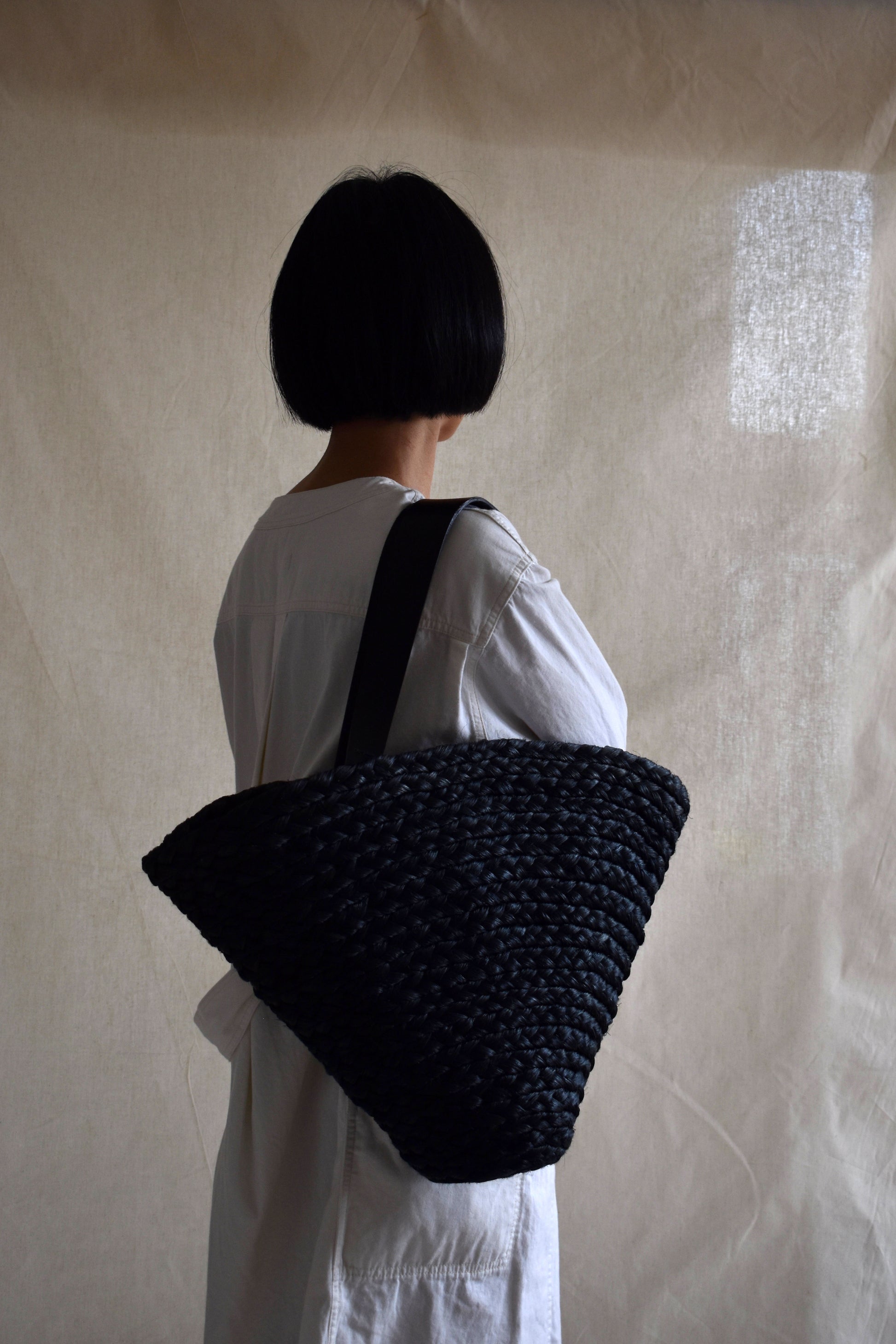 A triangular shaped bag and proving to be a hit with our shop stockists out of the abaca modular basket bag range.